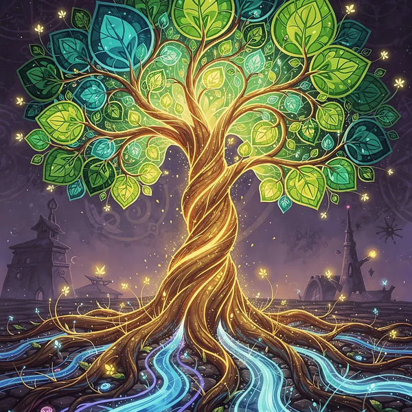 Immerse yourself in the mystical world with this magical Tree of Life diamond painting. The picture features a beautifully twisted, light-glowing tree with leaves that shimmer in shades of green and blue. The tree's roots spread across the ground, forming magical streams that bring life and movement to the piece. This small but detailed project offers a relaxing and rewarding experience for all craft enthusiasts.